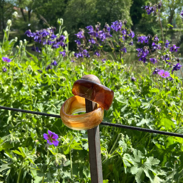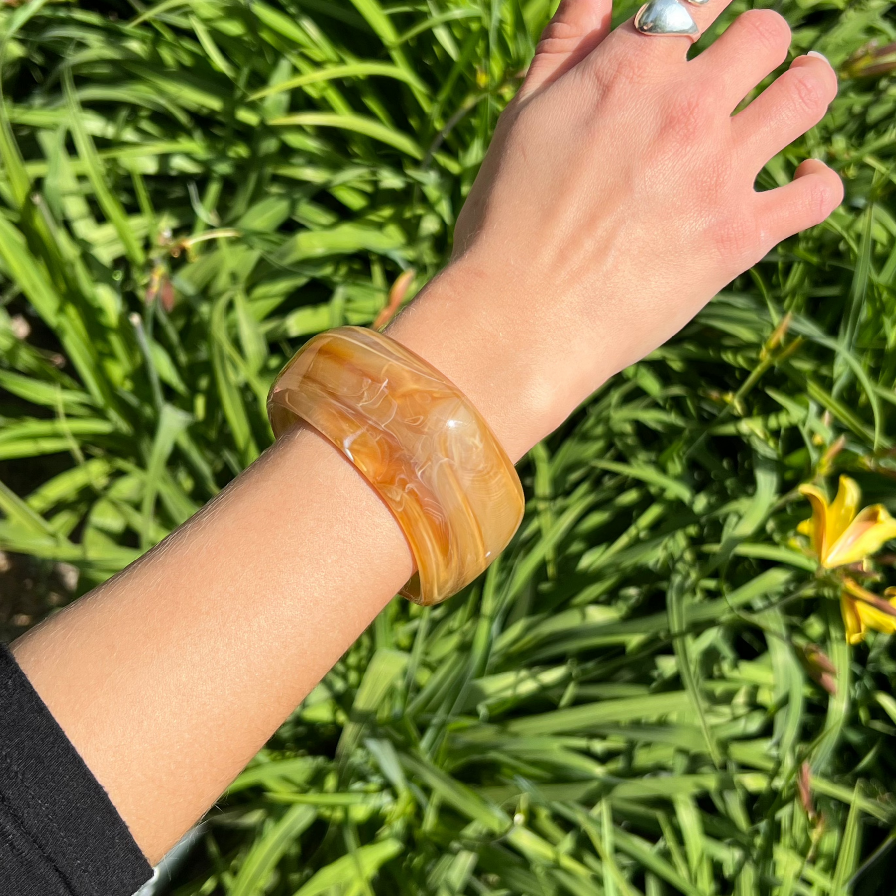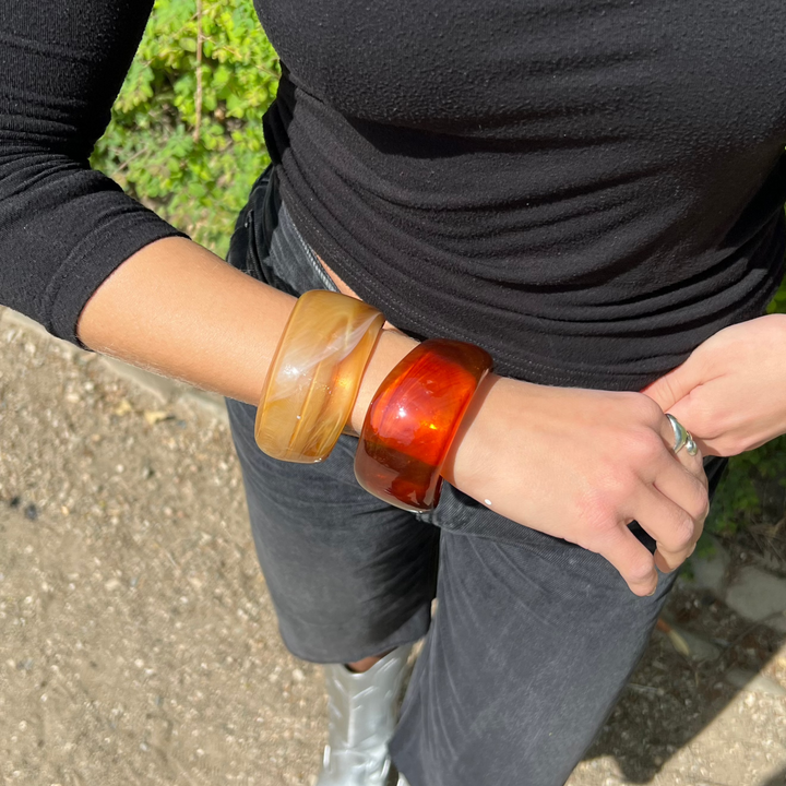 Et farverigt statement med et legende twist. Disse chunky bangles er lavet i let gennemsigtig plastik og har smukke farvespil, der minder om flydende honning og blød karamel.
