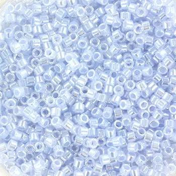 Små Miyuki Delica rørformede glasperler i lys blå med perlemorsskær.