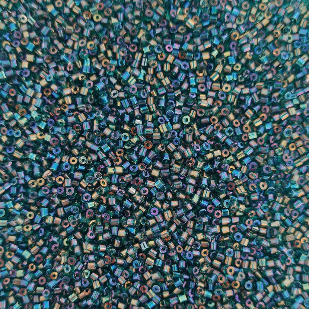 Små blå rørformede glasperler med skær i alle regnbuens farver.