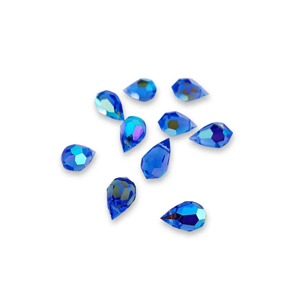 Preciosa crystal drops i farven Sapphire AB. Krystallen er topboret, dvs. boret på tværs i den spidse ende af dråben. AB belægningen giver perlen et eventyrligt regnbueskær.