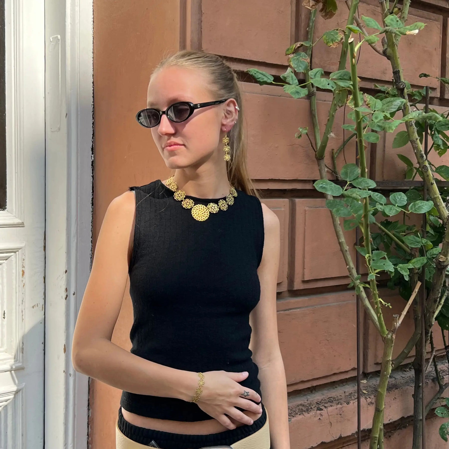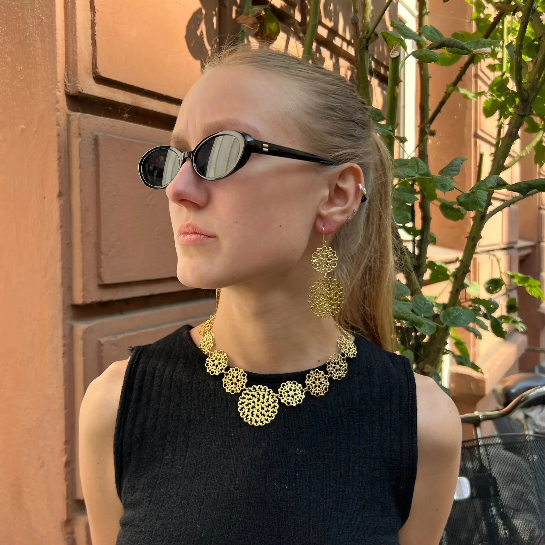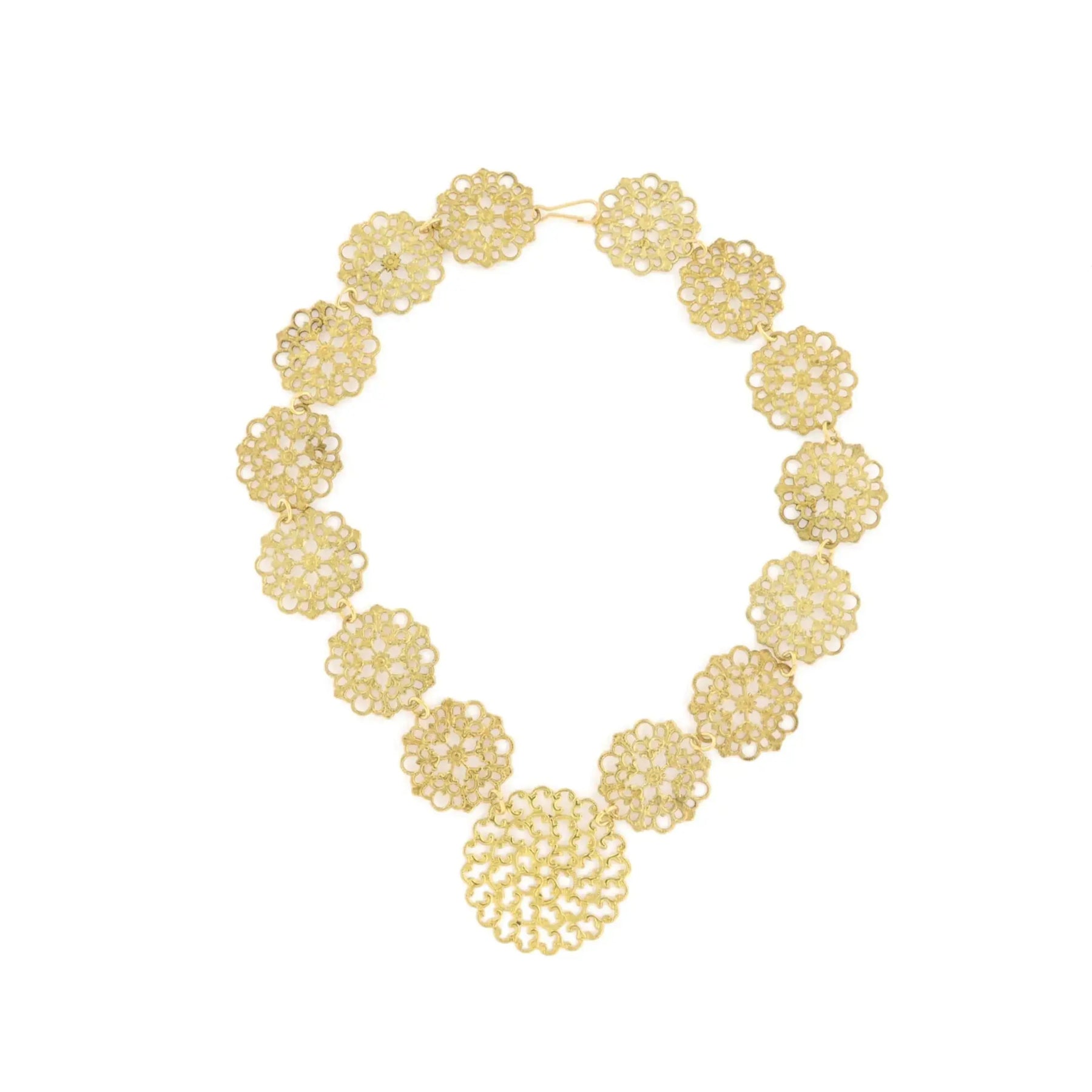 Smuk vintage halskæde i forgyldt messing, udsmykket med 14 små filigranvedhæng og et større, detaljeret filigranvedhæng i midten. Halskæden måler 42 cm og har et elegant, tidløst udtryk, der passer perfekt til både hverdag og særlige anledninger.
