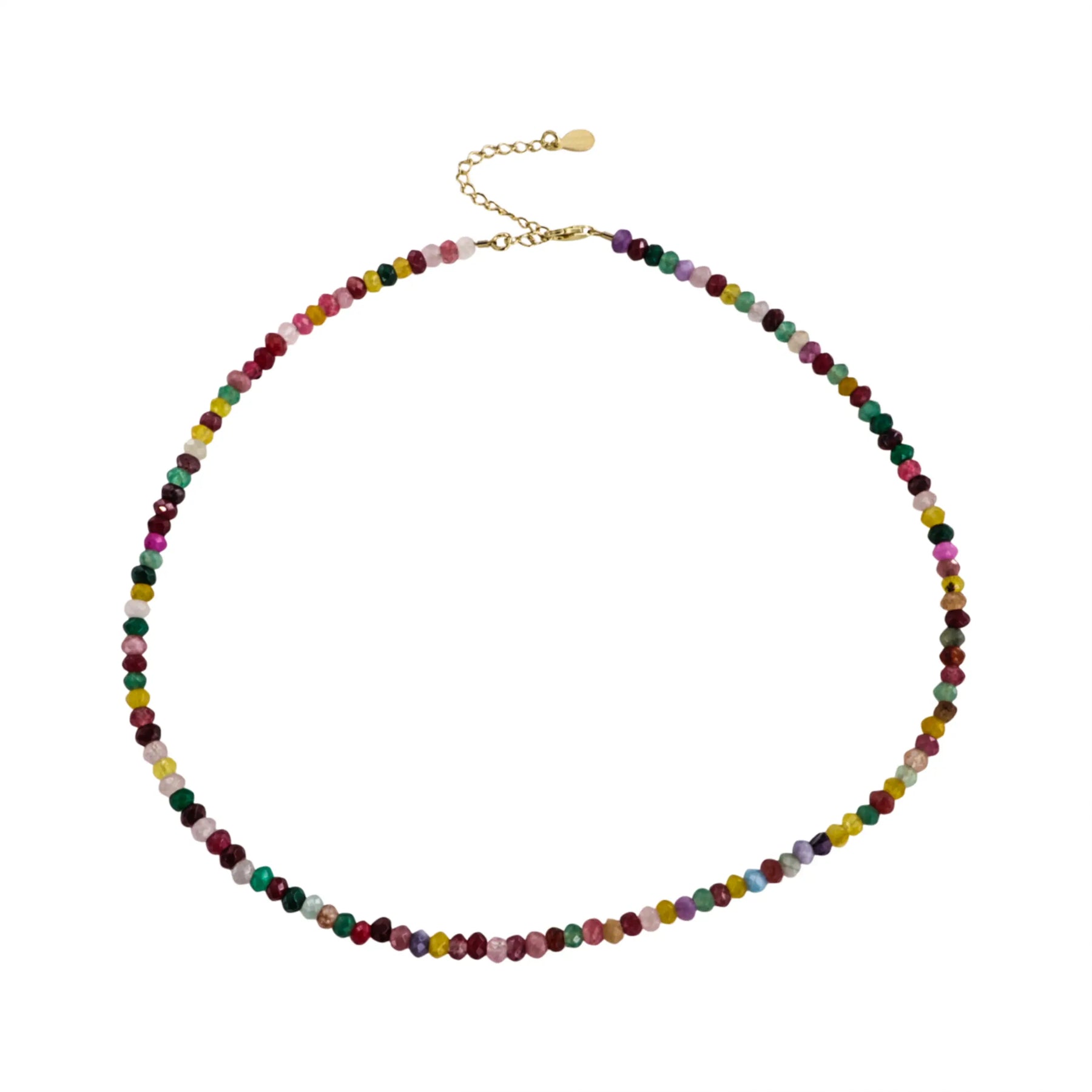 Farverig halskæde i facetteret mix agat – en sammensætning af smykkestensperler i flotte, nuancer som rød, blå, gul, rosa og grøn. De små rondel-formede perler er let facetterede, hvilket giver et diskret glimt og et organisk, levende udtryk.