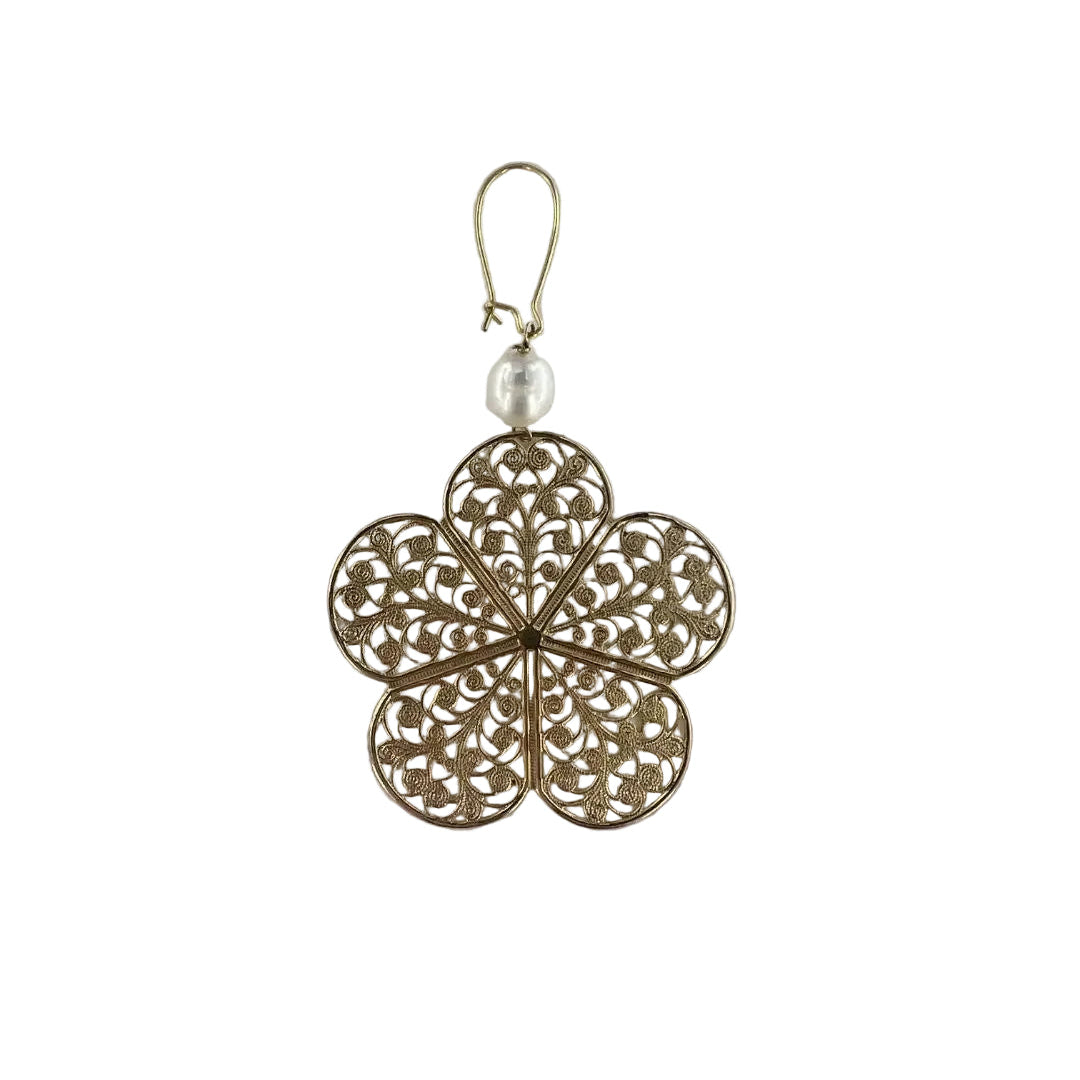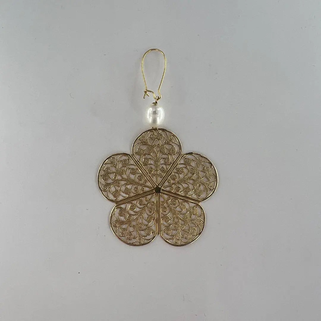 Denne iøjnefaldende ørering er udført i forgyldt messing og kombinerer en smuk hvid ferskvandsperle med et stort, detaljeret filigran-blomstervedhæng. De fine, snoede detaljer i blomsten giver et let og romantisk udtryk, mens perlen tilfører et klassisk og feminint touch.