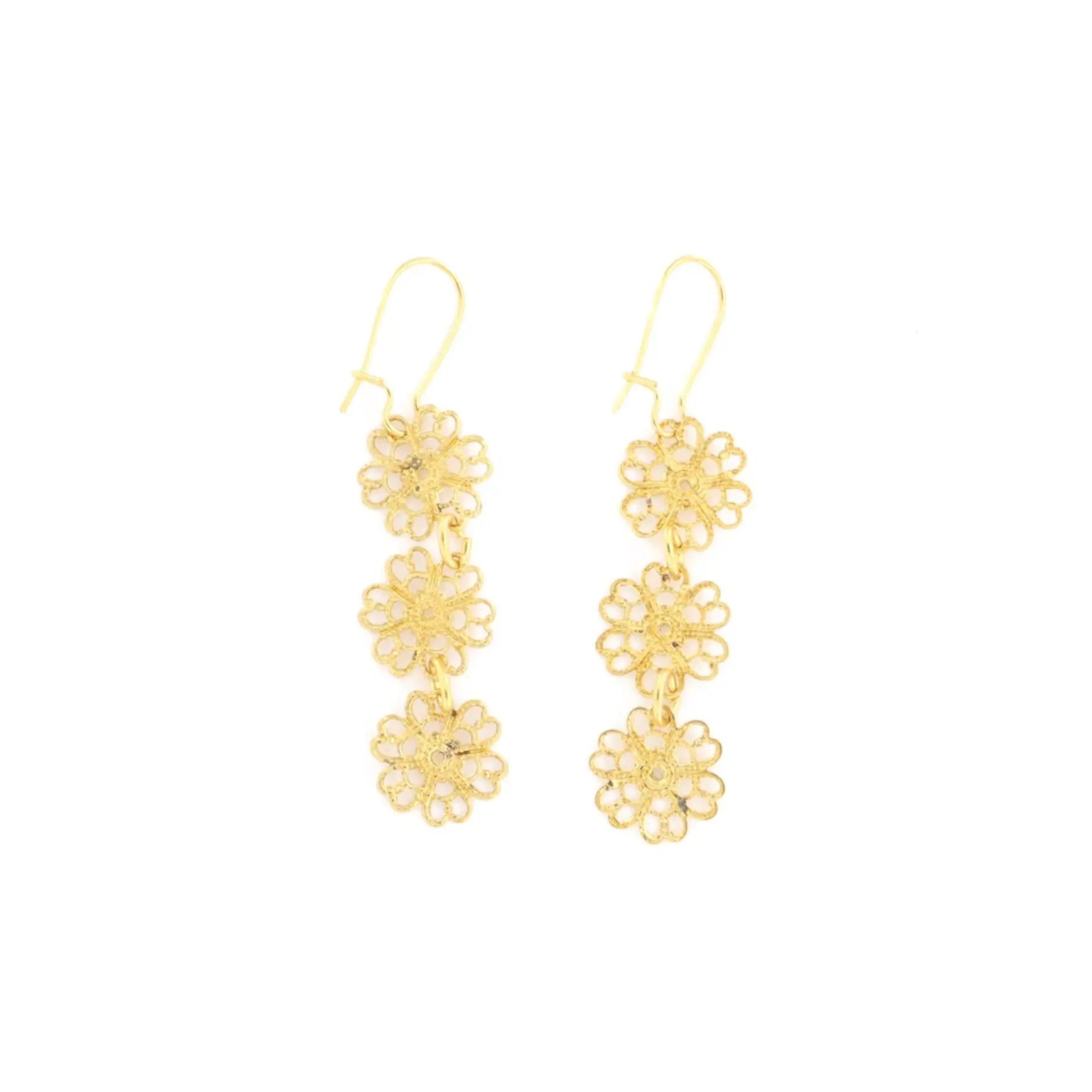Smukke, feminine øreringe i forgyldt messing, designet med et langt vedhæng bestående af tre små filigranblomster. Med deres mål på 65 x 15 mm har de en elegant længde, der skaber et let udtryk.