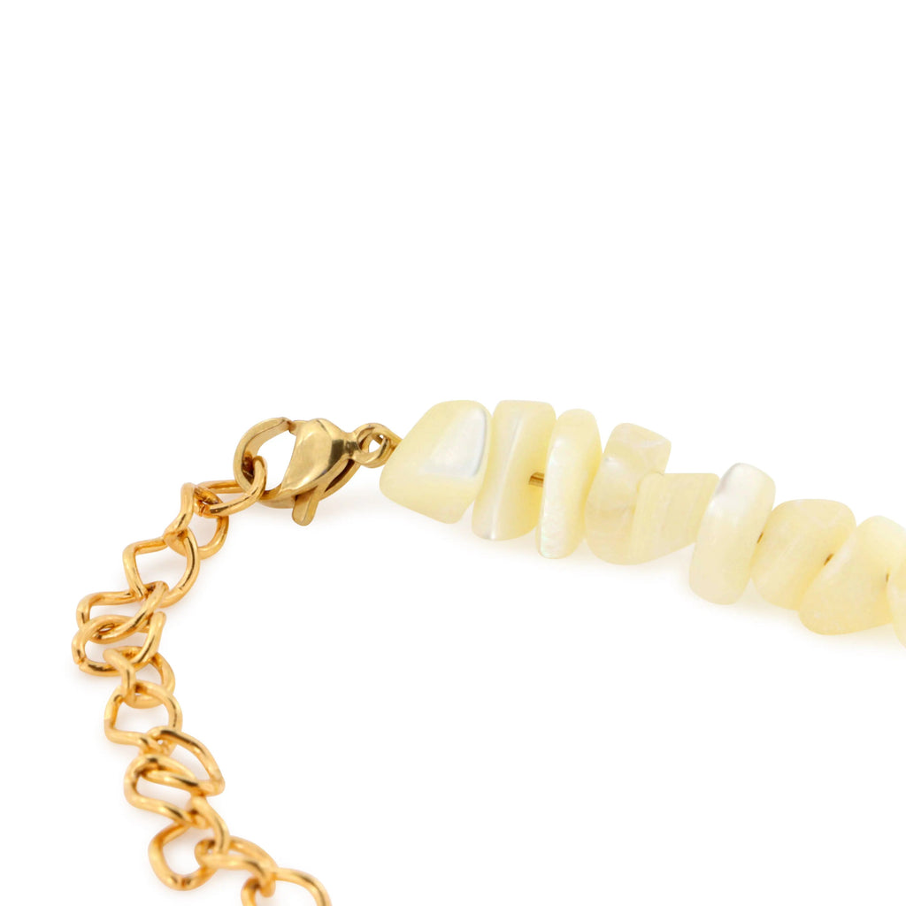 Justérbar halskæde af perlemorschips med lås og kædeforlænger i forgyldt stål.