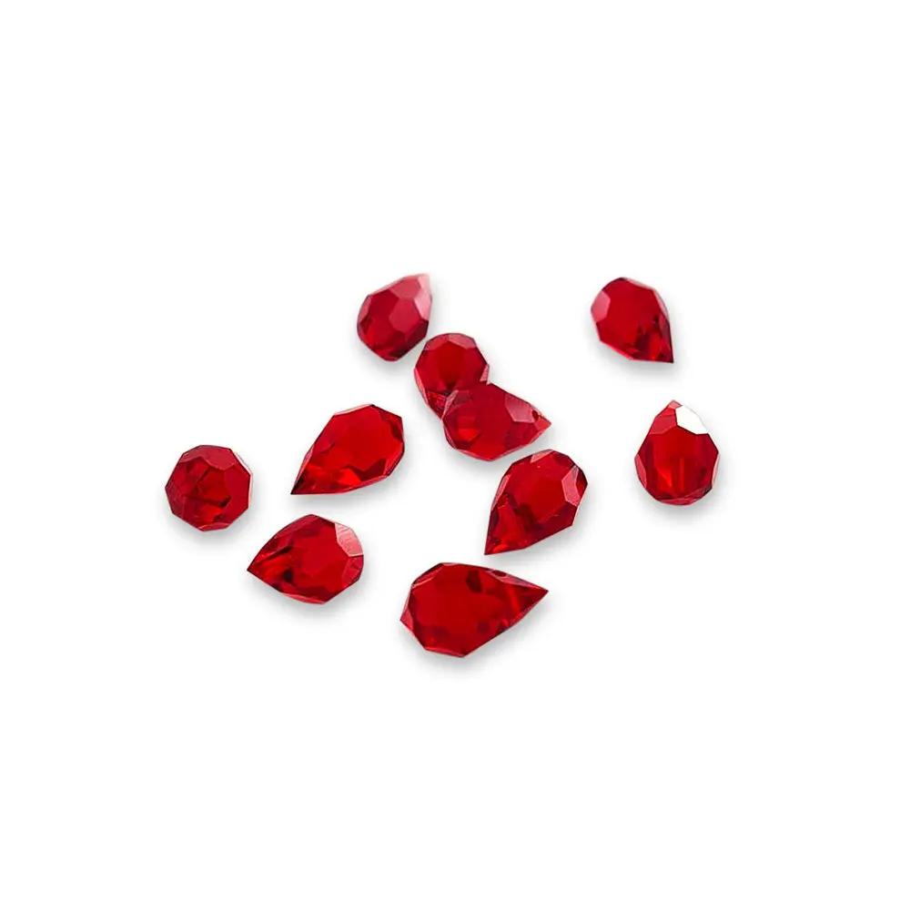 Rubinrøde Preciosa crystal drops i farven Siam Ruby. Krystallen er topboret, dvs. boret på tværs i den spidse ende af dråben.